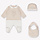 This Fendi baby set is a cute and stylish outfit for little ones. The set includes a baby romper, a matching hat, and a bib, creating a complete and coordinated look. On the chest of the romper, there is a horse illustration in the center, with white legs and little feet, adding a playful and charming detail. The romper comes in a beige color and features a white collar, giving it a soft and elegant touch. The soft material feels gentle on the baby’s skin and provides plenty of comfort. The fit is relaxed, allowing freedom of movement for the baby. Perfect for everyday wear, special occasions, or as a gift set. A beautiful and fashionable baby outfit that is both stylish and practical.