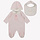 This adorable Fendi baby outfit is perfect for your little one. The romper comes in a soft pink color and features built-in feet to keep your baby warm and cozy. Long sleeves provide extra comfort and warmth on cooler days. A cute bear on the chest adds a playful and charming detail. The white collar gives the outfit a stylish and classic touch. The set includes a matching pink and white hat, perfectly completing the look. It also comes with a white and pink bib, ideal for mealtime. Made from soft, high-quality materials, it feels gentle and comfortable against delicate baby skin.