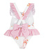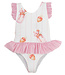 This Meia Pata swimsuit is a cute and cheerful swim outfit for little girls. The swimsuit comes in white with subtle pink stripes, giving it a fresh and summery look. Adorable prints of strawberries and milkshakes are scattered across the fabric, adding a playful touch. The pink trim along the shoulder straps and waist provides a stylish contrast and charming detail. At the back, a bow adds an extra sweet and girly touch. Made from soft, high-quality materials that feel comfortable on the skin and are perfect for swimming. The swimsuit has a comfortable fit and allows plenty of freedom of movement during water play. A charming and playful swim outfit that will make any little girl look adorable and stylish.