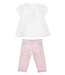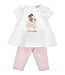Deze Monnalisa set is een schattig en comfortabel outfitje, perfect voor babymeisjes. Het setje bestaat uit een roze legging met een all-over print van witte bloemetjes, wat zorgt voor een vrolijke en zomerse uitstraling. Het bijpassende witte T-shirt heeft korte mouwen en een iets langer model, wat extra comfort en bewegingsvrijheid biedt. Op het shirt staat een lief meisje afgebeeld samen met een schattig konijntje, wat het geheel extra charmant maakt. Gemaakt van zachte, hoogwaardige materialen die prettig aanvoelen op de huid van je kleintje. Het setje is makkelijk aan- en uit te trekken en ideaal voor dagelijks gebruik of speelafspraken. Perfect te combineren met schoentjes of sandalen voor een complete look. Een lief, speels en stijlvol setje dat iedere baby girl er schattig en verzorgd uit laat zien.